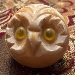 Set of three carved stone owl figurines. Features intricate details and vibrant colors. Perfect for home decor or as a gift.