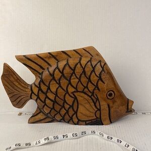 Gorgeous large carved wooden fish. Approximately 9 inches tall and 15 inches wide with the depth of approximately 2 inches. This big guy weighs approximately 2 pounds.
