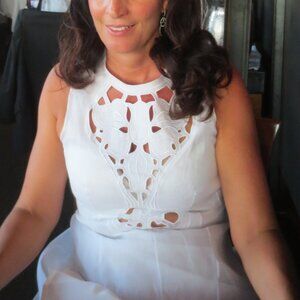 Carven Runway dress, white organza with cutout embroderid detail, size 20, made in Maldovia, pit to pit is 34", waist 28"