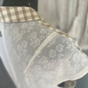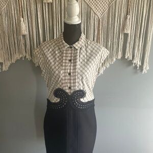 Pre-owned Carven white dress featuring a beige gingham pattern throughout, tonal floral embroidery insert at back, pointed collar, cap sleeves, black skirt with eyelet cut out detailing at waist, two slip pockets at hip, button up front, and zip closure at back. Lined.