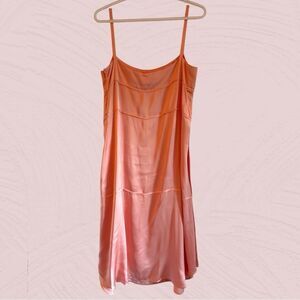 Beautiful and unique satin dress from Carven. Peachy pink satin midi dress with spaghetti straps and horizontal frayed hem details as well as front pockets with monochrome buttons. Side zipper. Really pretty and different from your typical slip dress. Size 40 is a size 8US. Originally over $600. Excellent condition.