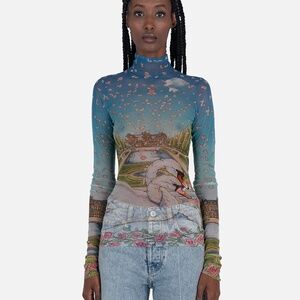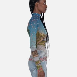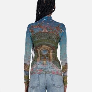 The L'Amour En Fleur printed mesh top is an all-over printed design featuring seasonal artwork, inspired by nature and architecture. Completed with a polo neck, long sleeves that extend over the wrist, and a Casablanca Paris branded label.