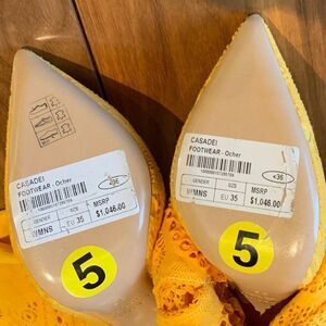 WOW! THE most amazing boots from Casadei, renowned Italian high end footwear manufacturer. New, tags still in place size 4 (euro 35). Because we don't have a size 4 foot model, we have taken the black version photo from the internet (e bay, used, $511.02) to illustrate the look. Ours are saffron yellow, a rich and complex shade. The shoe itself is a "blade", 4.5 (or so) inch stiletto heel, pointed toe, pump in sumptuous real suede. The stretch netting or knitted leg is permanently attached to the shoe upper and can be rolled or scrunched for different looks. Fabric content of knitted upper unknown, very stretchy for guaranteed fit. Darling (and daring) little velvet bow detail all the way up the back. Never worn with stickers intact. No damage or wear, some handling smudges (see photos) that can probably be gently cleaned. We have not attempted to do so. Original selling price $1046.00 American. Enjoy being a girl in these ever so sexy, over the knee boots/shoes/pumps from Lemon Squeezy Shop🍋