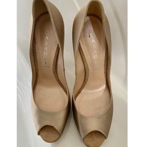 Casadei Champagne Satin Platform Peep Toe Pumps