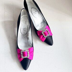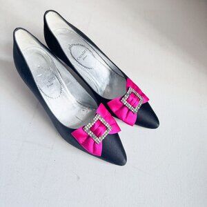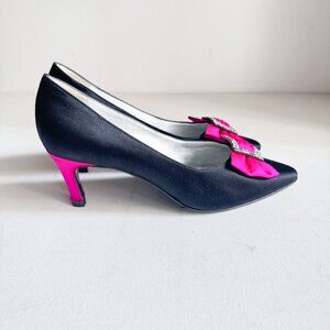 Casadei Luxe Vintage Satin Rhinestone Bow Black Pink Kitten Heels.