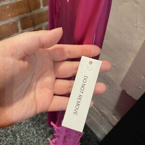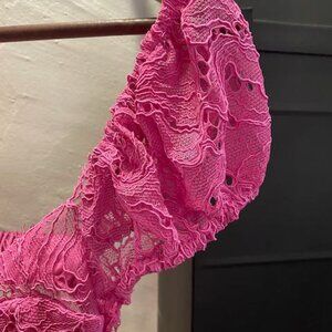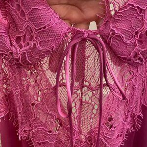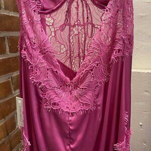 This floor-length maxi dress features a form-fitting top with lace detailing and a flowing skirt.