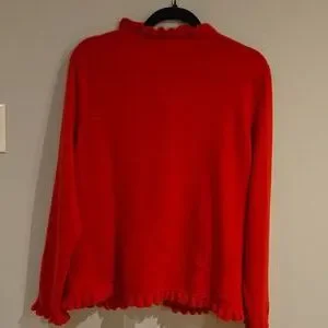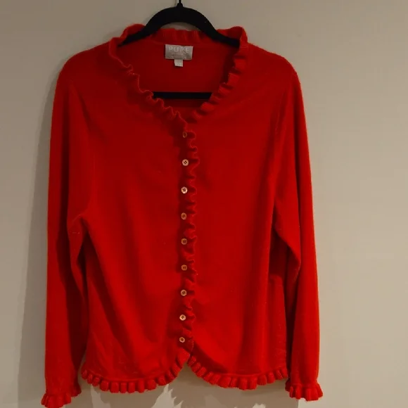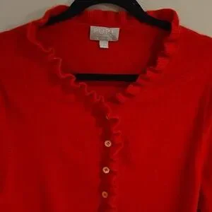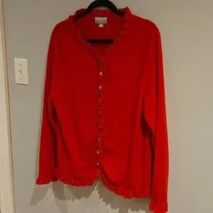 Vibrant red cardigan with ruffle trim. Button-down front. Soft and feminine. Reposhing because the colour is not good on me. The cut is lovely as a slightly oversized look, open or closed. Great with a white tee shirt and jeans.