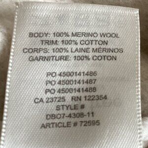 The men's blue sweater is 100% Merino Wool and has 2 small holes