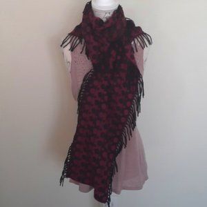 This super soft and versatile scarf is reversible and striped in shades of raspberry and black with large and small dots in the corresponding colour down each stripe. Fringed in black down the length of each side. Approx 64" long, 8 3/4" wide not including the fringe and 13 3/4" wide including the fringe. Made in Germany. In excellent condition no holes or stains. (A) 11/12