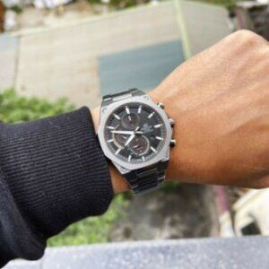 Slim Solar Powered Chronograph with Sapphire Crystal | Although multi-hand chronograph cases tend to be thick, this is a solar powered chronograph with a case kept to a thickness of 9.7 mm to provide an enhanced fit. The watch boasts a flat octagonal bezel with a hairline finish that creates a sporty yet luxurious design. Uses a scratch-resistant sapphire crystal. The combination of a case and band given a black ion plate for scratch-resistance and a red accent color creates a bold design.