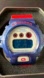 Bold Casio G-Shock with digital display. Features blue and red accents. Shock resistant design.
