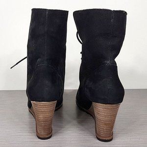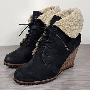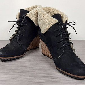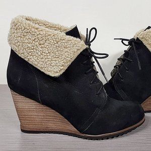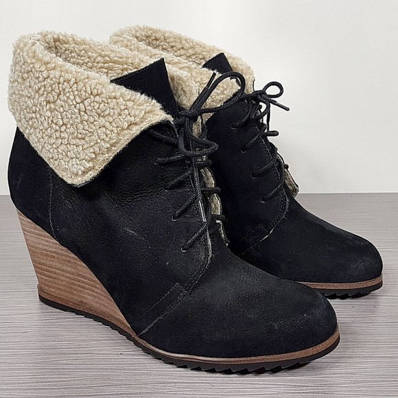 A faux-shearling-lined cuff and a lace-up profile give this bootie a flirty après-ski appeal while an articulated wedge sole gives it added traction in wintry conditions.