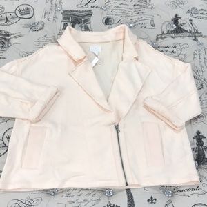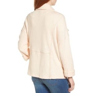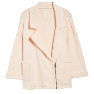 Raw-edge detailing and a relaxed silhouette bring laid-back attitude to a moto-inspired knit jacket.