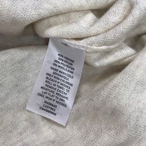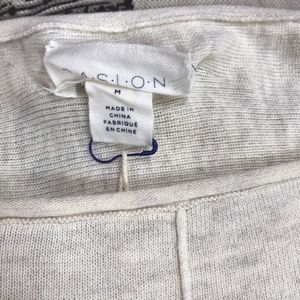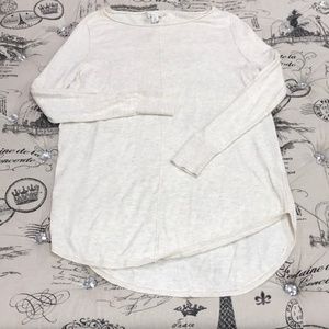 A high/low wool-kissed tunic knit in a fine-gauge delivers subtle visual interest with exposed seams and mixed-rib details.
