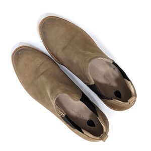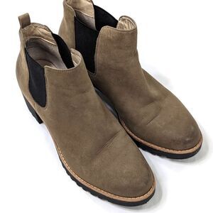 Olive green grey mildly distressed leather nubuck upper, rubber lug sole. Water resistant.