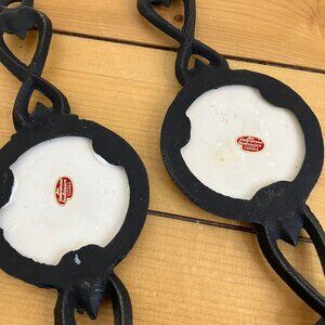 Vintage set of 2 cast iron wall hangings in the shape of a serving spoon & fork. Each one has a ceramic tile inset, with different kitchen toleware motifs. Approx. 13 1/4" long x 3 1/2" wide. Backs of ceramic tiles say "Made in Japan" with "An Enterprise Exclusive Toronto, Canada" stickers. Good vintage condition, pieces have a few small surface marks from display/storage.