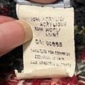 black, read, white and patterned acrylic and wool sweater, zippered front, has been worn but is in good shape, no tears or holes,