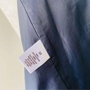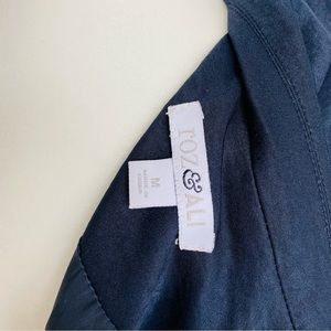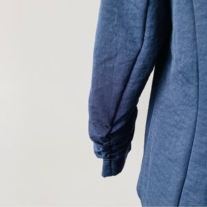 Casual navy blue blazer with 3/4 length cinched sleeves.