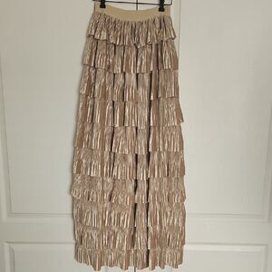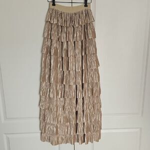This tan maxi skirt features a tiered design that adds a playful touch to its casual style. Perfect for resort wear, its lightweight fabric ensures comfort and ease of movement. The elastic waistband provides a flexible fit, making it an ideal choice for relaxed outings.