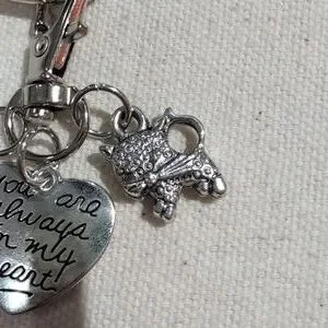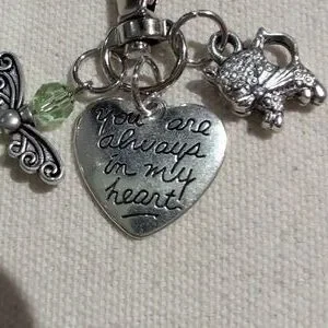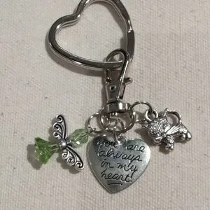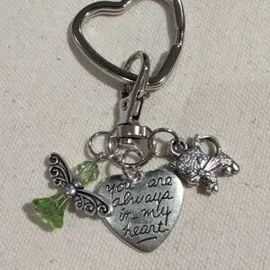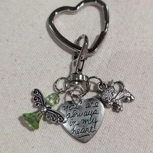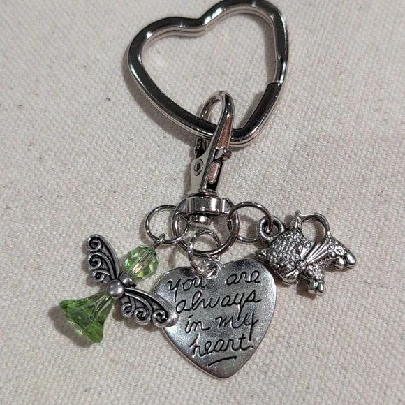 Silver heart keychain featuring a green angel charm charm and engraved heart pendant "you are always in my heart" and cat charm