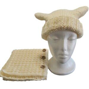 Cat Ear Beanie & Neck Warmer Set Winter Warm Ski Cap Hand Made Beige