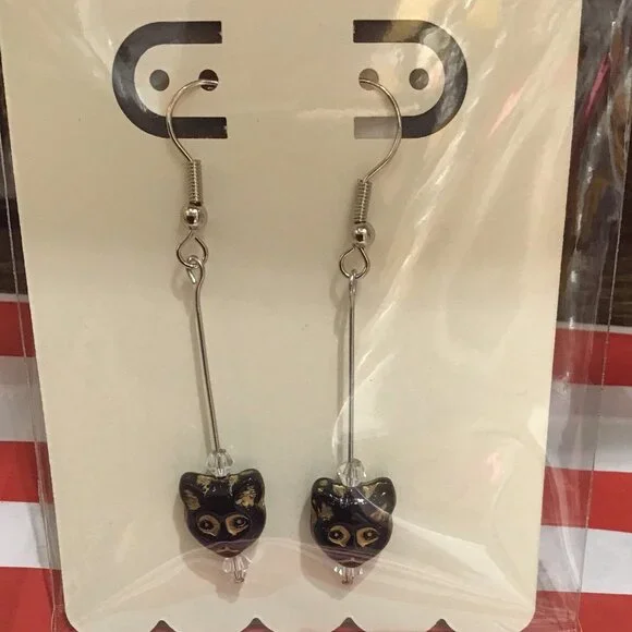 Black cat glass beads with gold highlights and clear bicone beads. Drop, hypoallergenic hook earrings,.