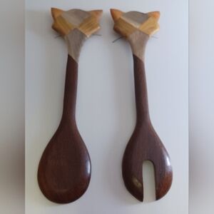 Cat Inlaid Wood Salad Servers Spoon & Fork Set