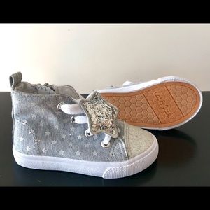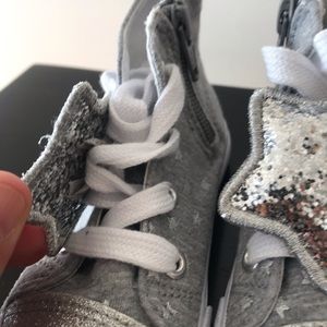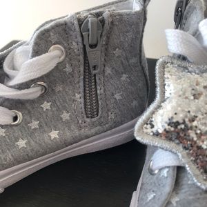 Little girl gray sneakers with glitter silver star lace charm.