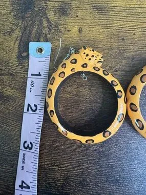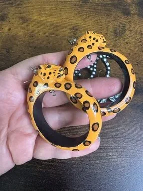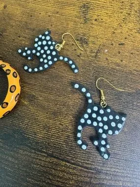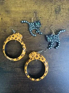 Cute earrings. One pair features yellow leopard hoops with black spots. One pair features cat silhouettes with polka dots. Playful and lightweight. Perfect for animal lovers.