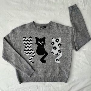 Super cute grey cat pattern drop shoulder sweater from SHEIN MOD. It has a crew neck and long sleeves and features three cats / kittens in different black and white patterns (stripes, solid and spots). Perfect if you love pets and are crazy for cats and kitties!