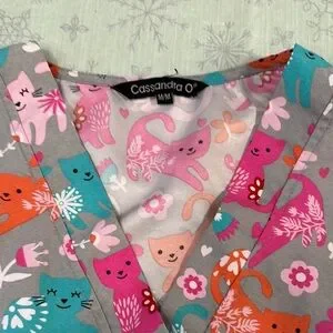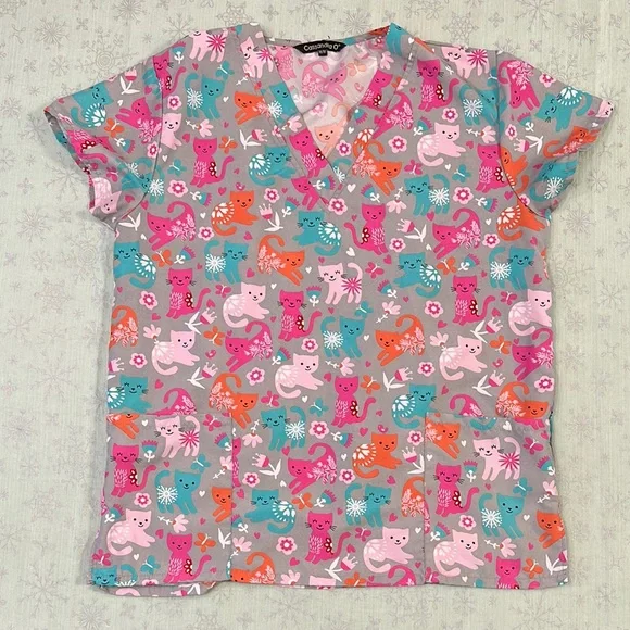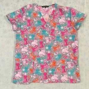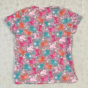 Cute, colourful scrub top that fits loosely. No stretch. 2 front pockets.