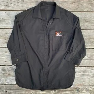 Stylish black button-up shirt featuring a car design on the pocket. Perfect for casual wear.
