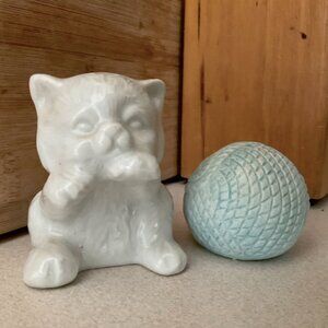 Midcentury style ceramic pair of salt & pepper shakers featuring an adorable Persian style cat and a sweet baby blue ball of yarn for it to play. Fit together in pose. Missing stoppers on bottom and small blemish on cats side, otherwise excellent condition.