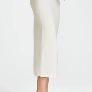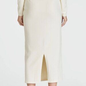 Contrasting trim highlights this polished midi-length sweater-skirt designed with decorative welt pockets and shiny goldtone hardware.