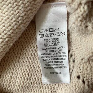 Cozy sweater dress in size 12 months from Catherine Malandrino Mini. Material: 60% cotton, 40% acrylic. Cream oatmeal knit with openwork details on neckline, sleeves, and hem. Felt flower appliqués along bottom hemline. Button closure at back of neck for easy dressing.
