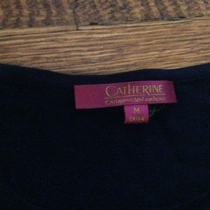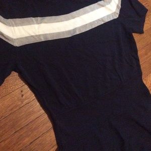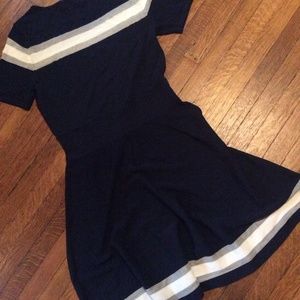 Navy with white stripes. Stretchy, swingy, short sleeves, panel waistband, flared skirt. Excellent condition