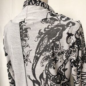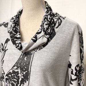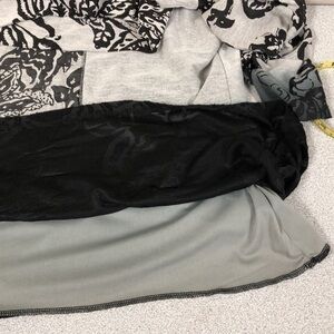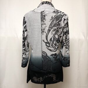 Unique tunic top! Fully lined with asymmetrical hem. Wash out along the bottom, with slight blue/black hue! Measurements in pics