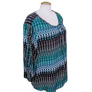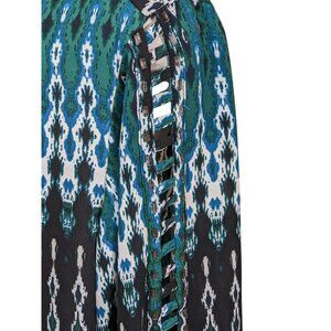 Cato Blouse Women Plus 26/28 Ikat Blue Green Boho Artsy Sleeve Ladder Cutout