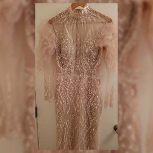 Beautiful, fully sequined, blush, catwalk couture gown. Size 10. Truly stunning, heads will turn!