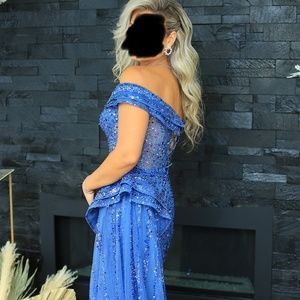Beautiful dress…head turner!! This dress has been Altered in the back to fit from size 6-10 thanks to the cords. Mint perfect condition.
