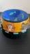 Cute vibrant blue bowl featuring a playful fish and cat design.