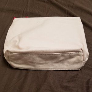 This travel toilette bag by Caudalie is made from a soft but sturdy canvas material in a pale pink, and lined with a darker pink material that appears to be water resistant. Very well made! It measures approximately 8" long by 6" tall, and about 3" wide at the base. Would be great for packing your skincare essentials for a trip, or even a day out to a seaside cottage, beach or poolside.