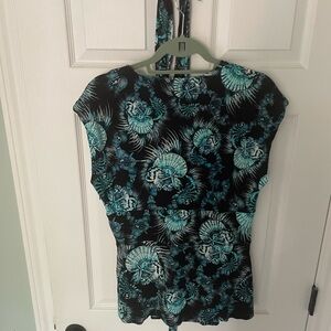 JustCavalli viscose top w/approx. 12’ wraparound belt: across shoulders 21”; shoulder to hem 26”; pit to pit 20”; side zipper.