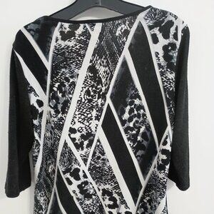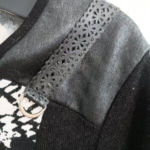 Cazza Petite print black knit sweater with faux leather on shoulders size XL