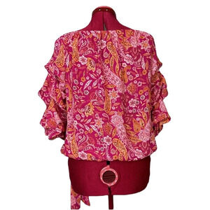 Elasticized neck, waist and cuffs; sleeves have a lot of fullness and are draped to create bell shapes on each arm. There’s a decorative fabric tie that hangs down on the front left.