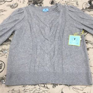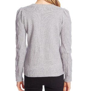 Entwined cable-knit stitching romantically details this cotton-blend sweater aptly framed by puffed-shoulder sleeves.