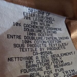 This high quality vintage coat is in good condition with minor flaws. It is made of wool & Cashmere. The fox fur trim is in perfect condition it cannot be removed. It was made in Canada. It is a vintage size 14. L/XL The lining has no flaws. The buttons are secure however have approximately a 3/8" thread gap between the coat and button. The buttons are secure and meant to have a gap, however the new owner should take care to ensure the button thread maintains integrity. An extra button is included.