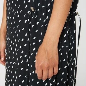 The black caftan dress with a white overall print is made by Cédric Charlier. The asymmetrically cut dress can be gathered at the sides using two drawstrings.