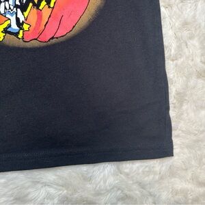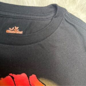 This black short sleeve tee features a striking pumpkin/skeleton graphic design with a vibrant orange and red circular background, creating a bold contrast against the dark fabric. The standard crew neck style ensures a comfortable fit, making it a standout piece in any casual wardrobe, especially during spooky season.