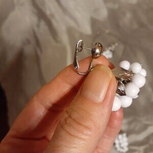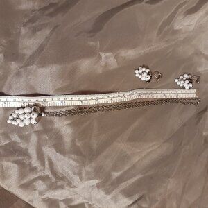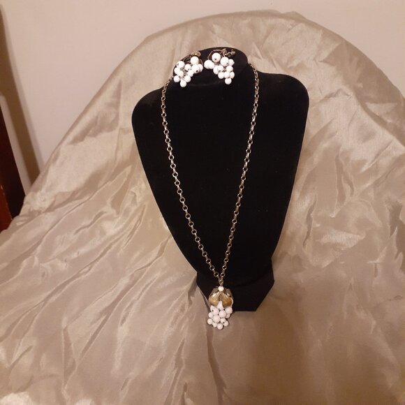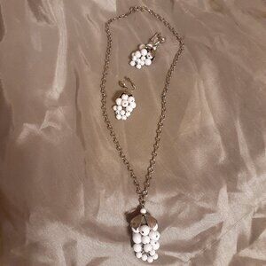 Gorgeous vintage 60's silver tone/white grape cluster necklace and pierced earrings set. In New condition. Post on earrings can be removed to transform into clip on earrings. Been told that the earrings posts are 14k gold, but have not verified. Necklace is 13" long, earrings are just over 2" long.